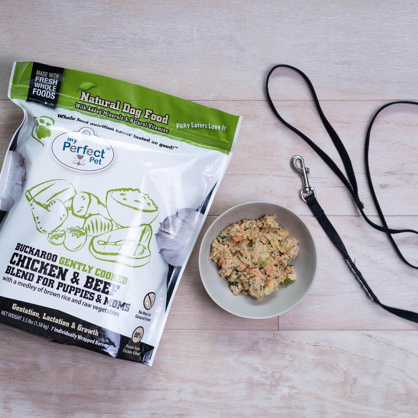 Introducing Gently Cooked Frozen Meals from My Perfect Pet. Each 3.5 lb. bag contains six individually packaged meals containing human grade, gently cooked meats blended with raw vegetables & fruit. What you see is what you get.