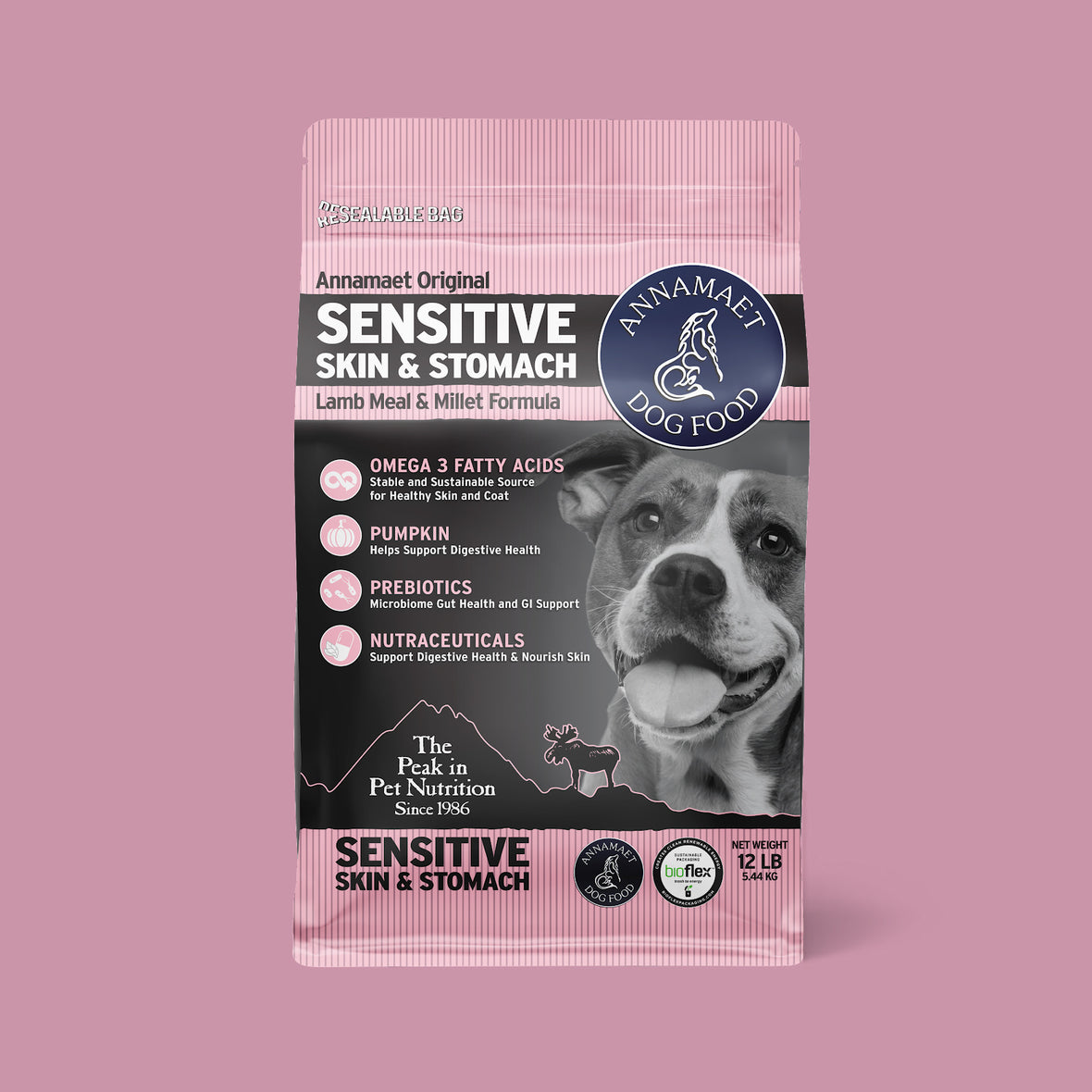 Annamaet Sensitive Skin & Stomach is a grain inclusive formula designed to help meet the unique dietary needs for dogs of all life stages. This formula contains functional ingredients for sensitivites: