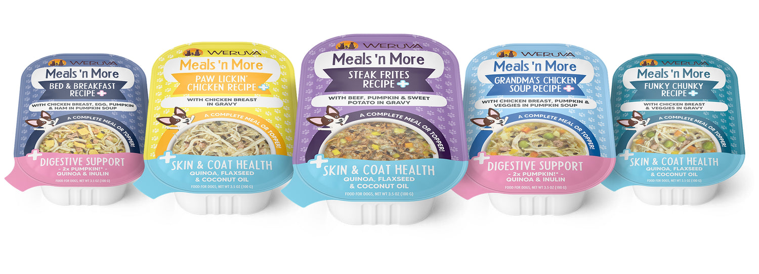 Weruva's new "Meals 'n More" wet dog food offers complete and balanced recipes packed with functional ingredients that can be served as a full meal or topper. Meals ‘n More features recipes to support both Digestion, as well as Skin & Coat Health. They're a meal in a cup for any sized pup!
