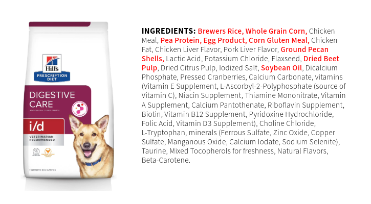 For example, lets take a look at the bag of dog food below. This is a relatively expensive food, prescribed by veterinarians, but knowing that ingredients are listed in decreasing order of predominance by weight, there are some immediate red flags.